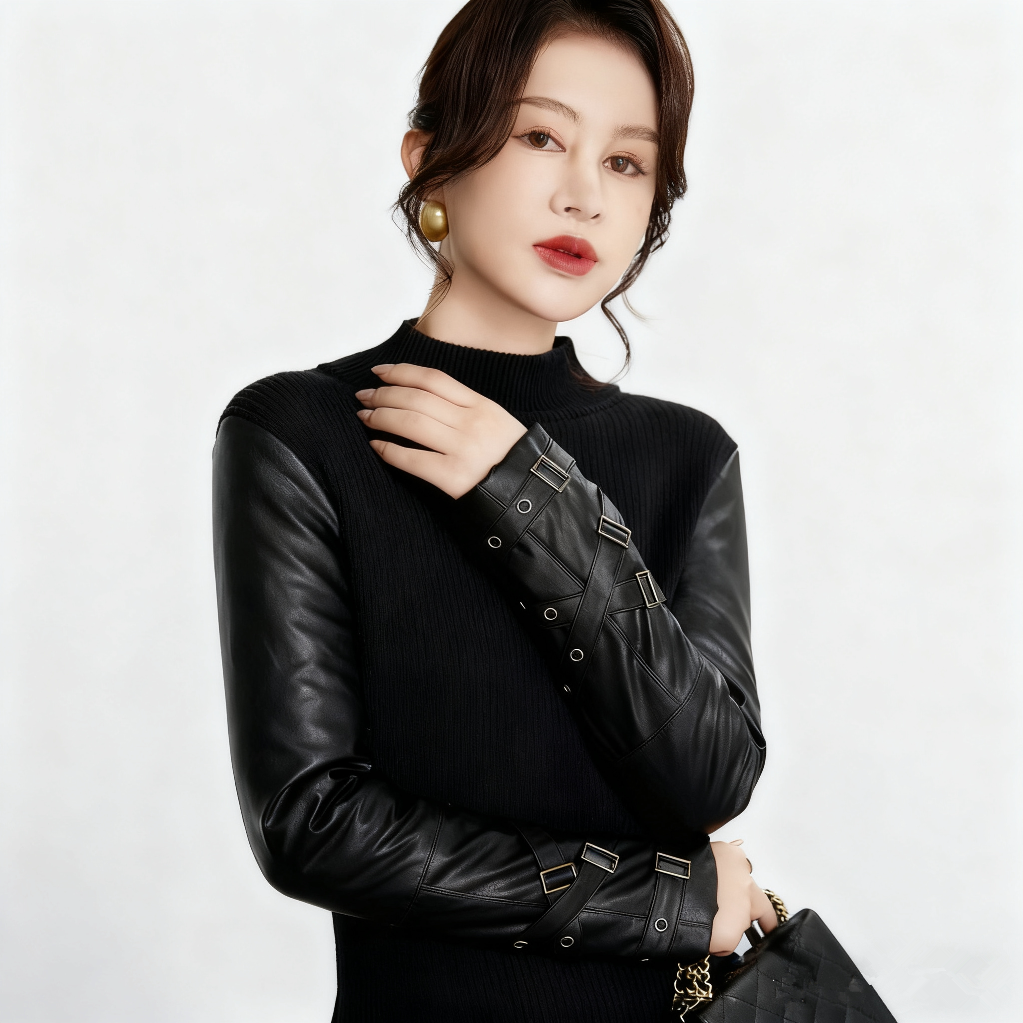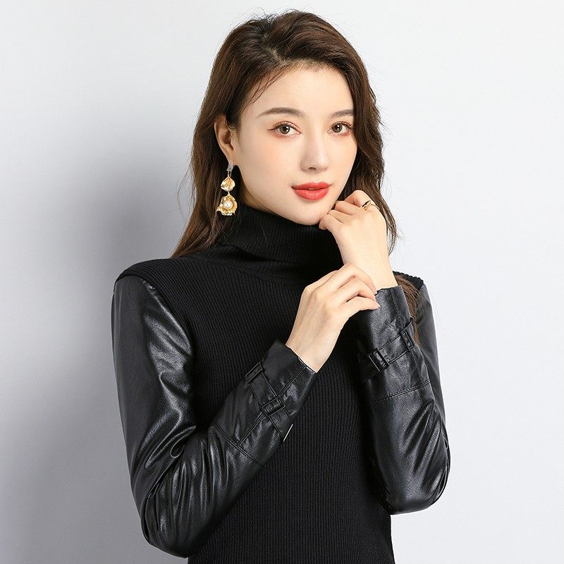 时尚新款高领皮袖打底衫女秋冬针织毛衣加绒加厚羽绒棉袖洋气内搭