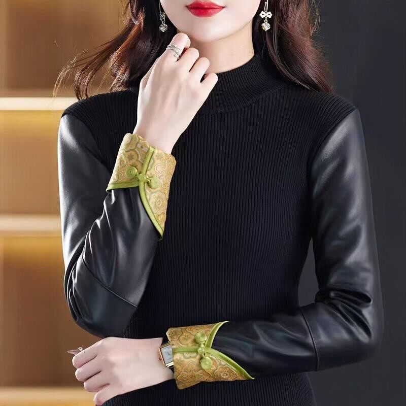 皮袖拼接针织打底衫女冬羽绒棉袖毛衣内搭袖子加厚上衣民族风国风