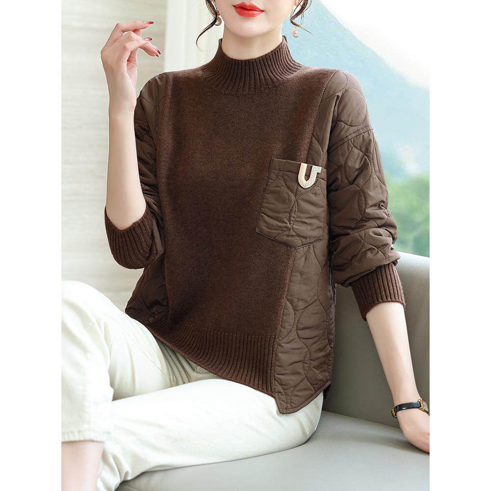 皮袖打底衫羽绒棉袖女士冬季新款百搭加绒加厚保暖毛衣内搭针织衫