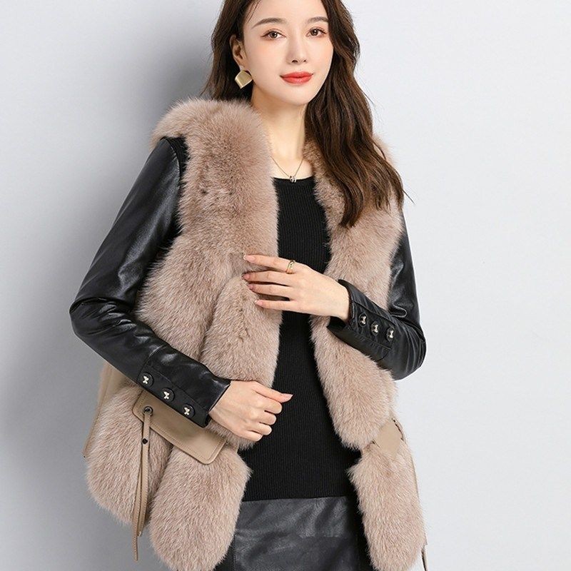 新款皮袖打底衫针织夹棉袖子加厚配羽绒皮草马甲高领套头毛衣女冬