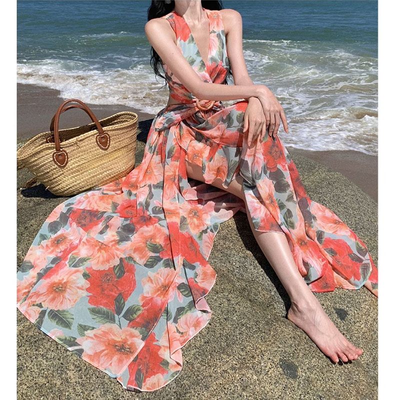 泰国海岛旅游度假沙滩长裙女夏季气质印花V领挂脖露背吊带连衣裙