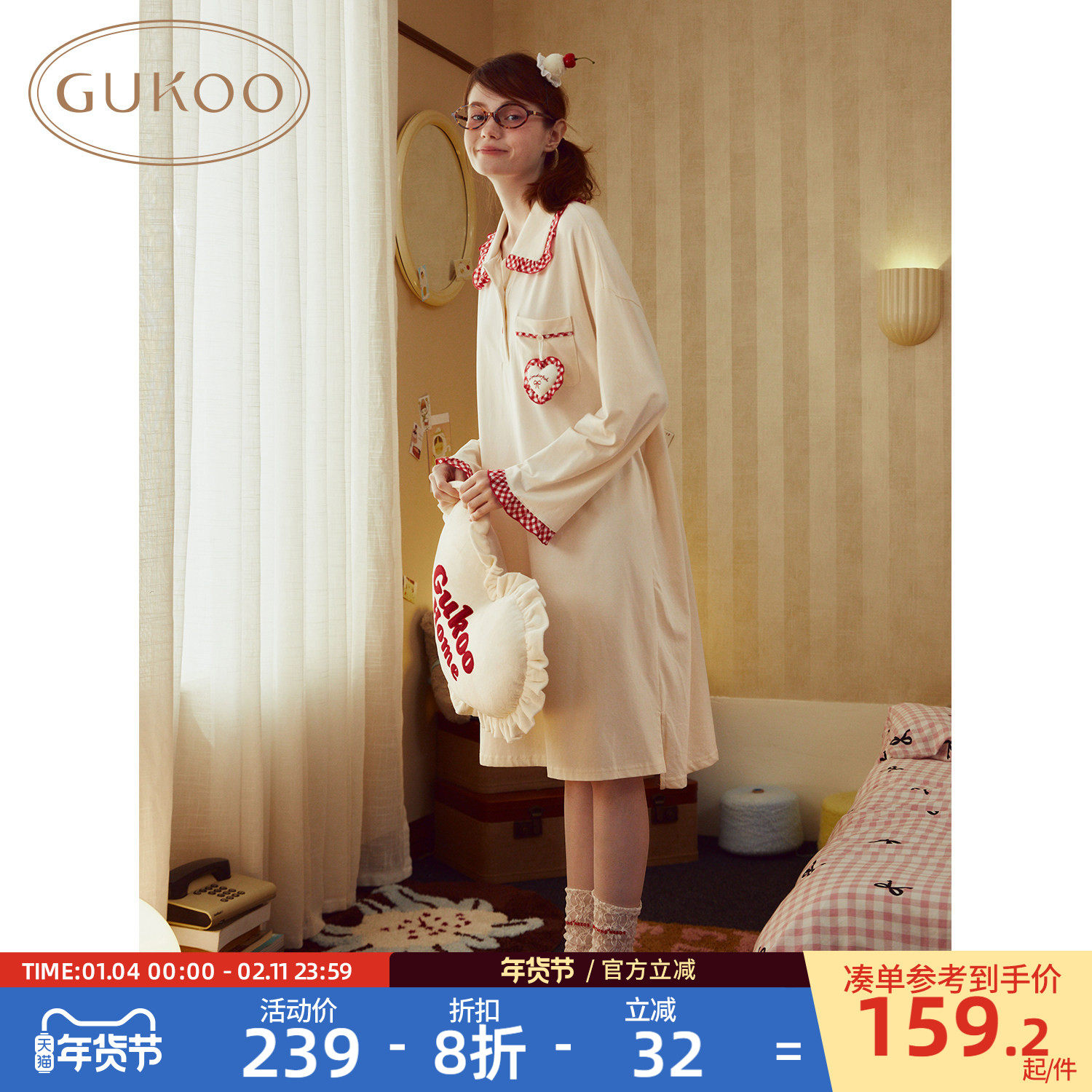 Gukoo/果壳睡裙女春秋款miiiiichan联名新款纯棉女士家居服睡裙A