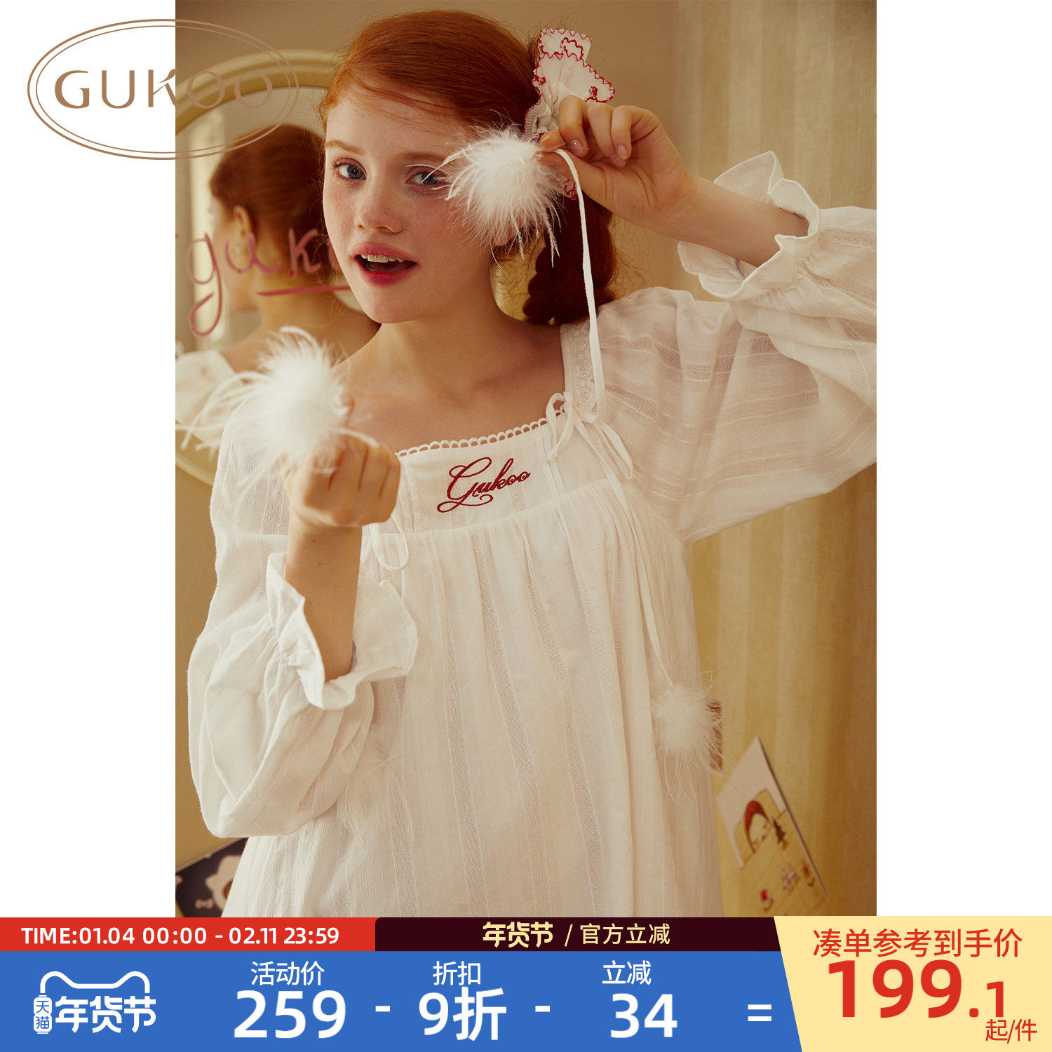Gukoo/果壳睡裙女春秋款网纱甜美新款纯棉简约女士家居服睡裙A