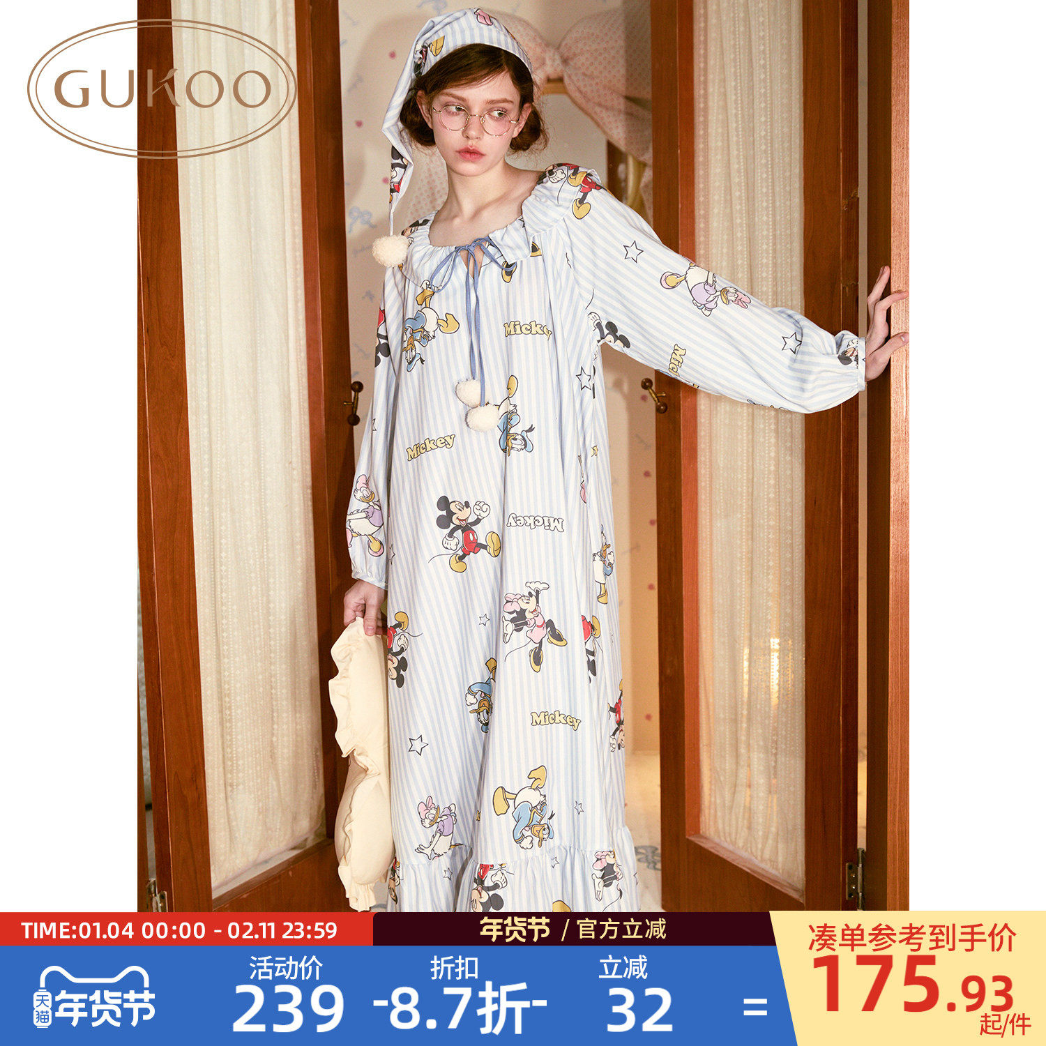 Gukoo/果壳睡裙女春秋款迪士尼联名新款波点纯棉女士家居服睡裙C