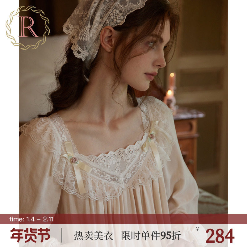 RoseTree棉纱睡裙女春秋季长袖长款蕾丝复古法式宫廷风双层纱睡衣