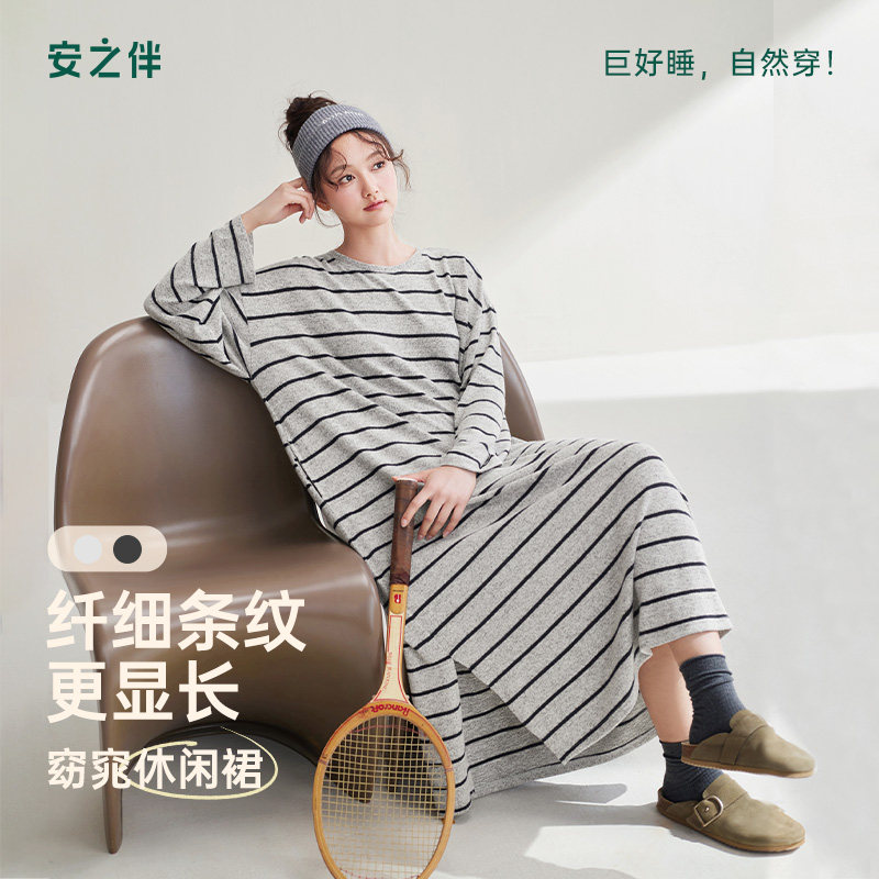 安之伴【巨柔软】睡裙女春秋季2026年新款睡衣条纹长袖长款家居服