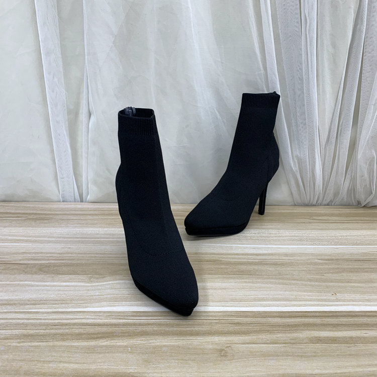 外贸原单女鞋尖头纯色细跟防水台网红针织弹力高跟瘦瘦靴偏小短靴