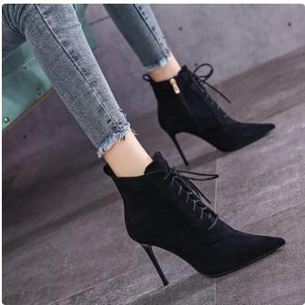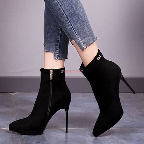 2022秋冬新款尖头高跟短靴女细跟性感瘦瘦单靴黑色绒面防水台裸靴