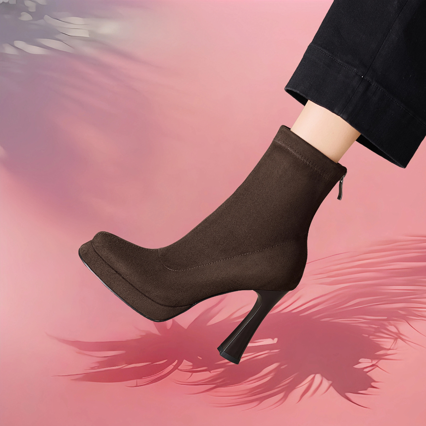 秋冬杏色瘦瘦靴高跟鞋女细跟法式气质短靴防水台绒面尖头弹力靴子