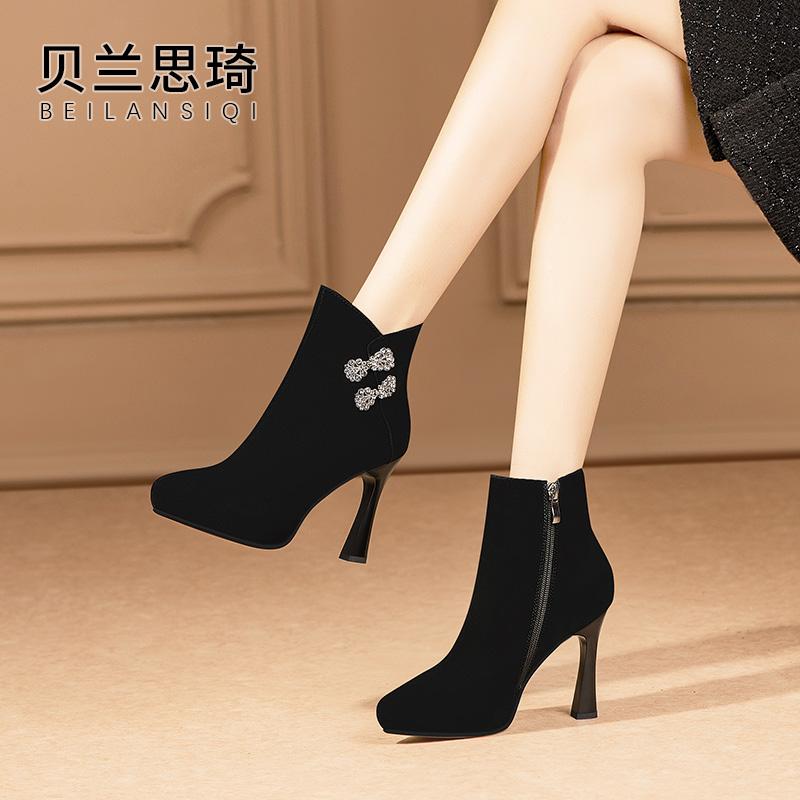 洋气水钻蝴蝶结精致高跟短靴女秋冬新款小个子防水台真皮女靴细跟