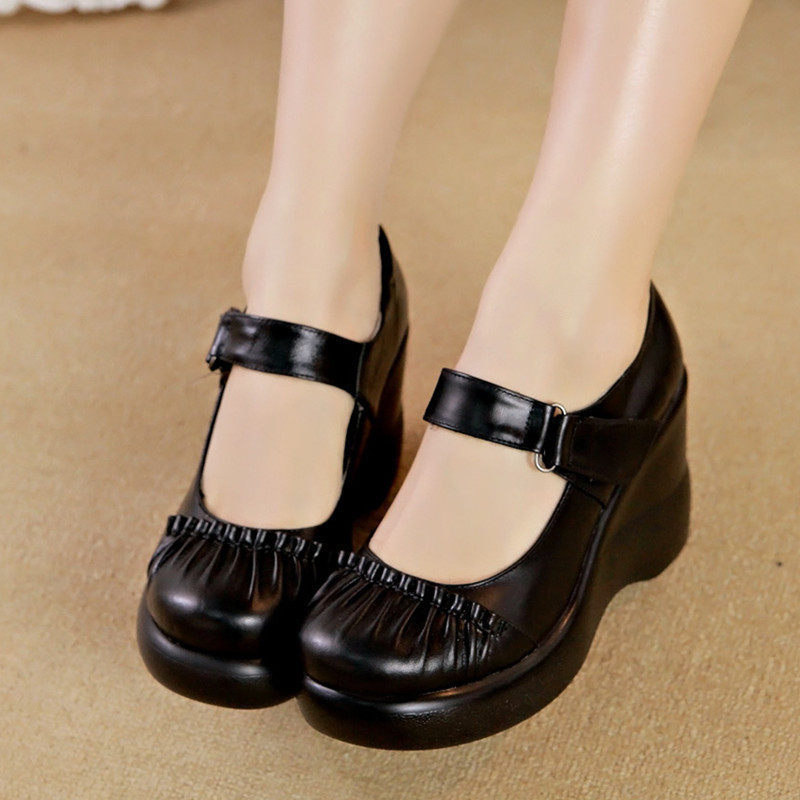 真皮女单鞋中跟浅口松糕女鞋厚底摇摇工作鞋黑色妈妈凉鞋春夏秋款