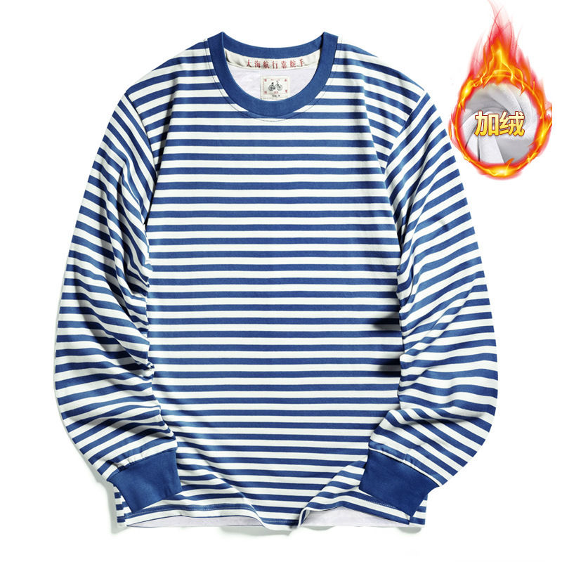 秋冬加绒加厚保暖重磅复古国潮海魂衫蓝白条纹长袖圆领T恤海军衫