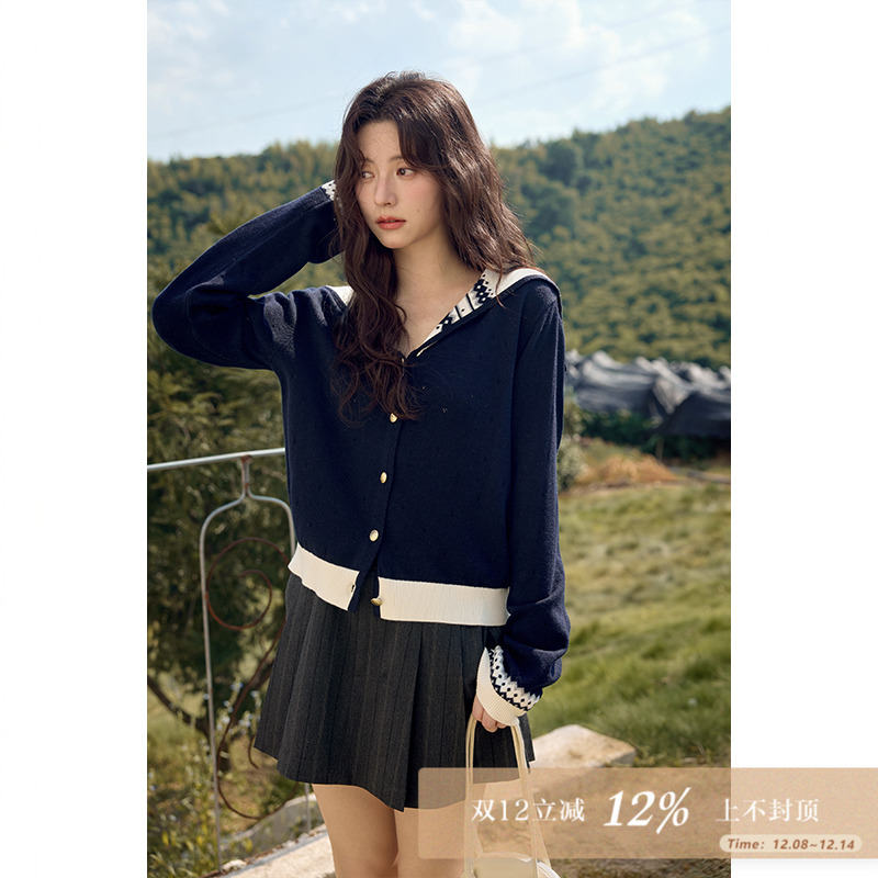 太平鸟 黑白撞色海军领针织开衫25秋季新款iu系千金风品质毛衫