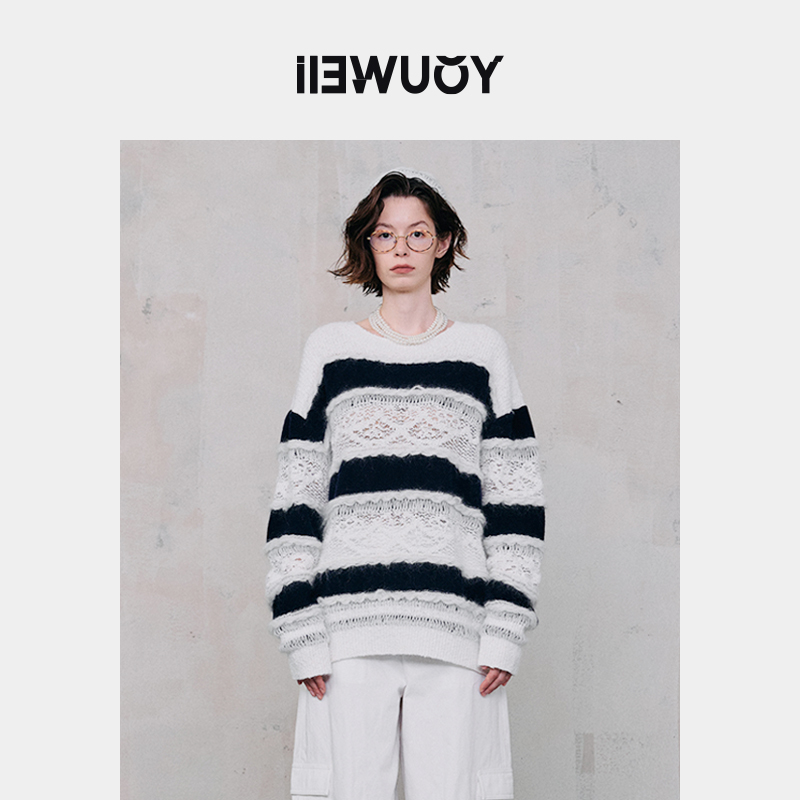 YOUWEI有尾2024冬季海军风蕾丝拼接套头毛衫针织毛衣Y2124408
