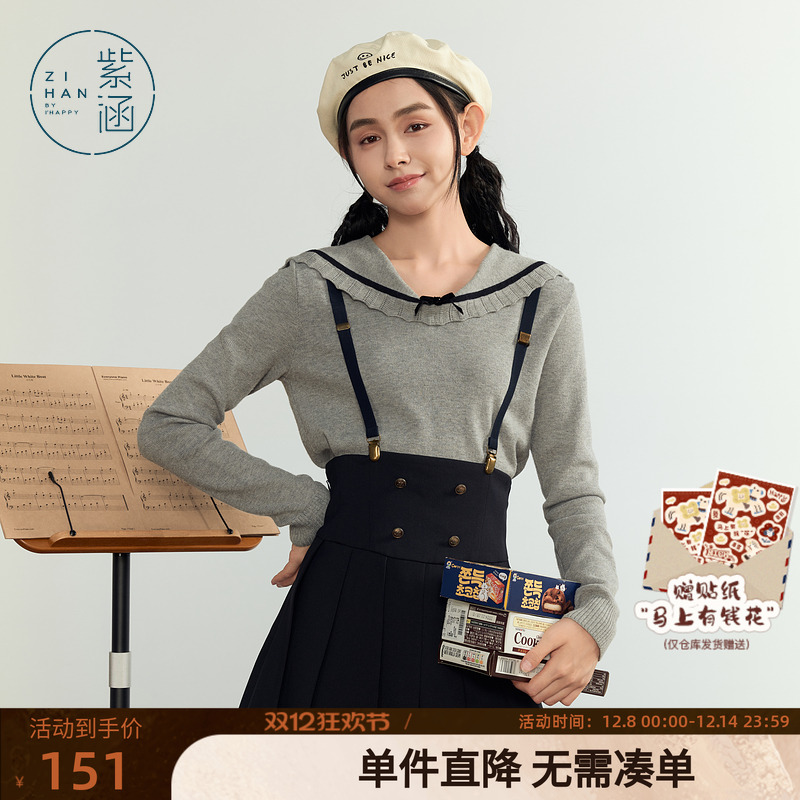 紫涵花边海军领套头针织衫女秋季新款甜美学院风休闲修身长袖毛衣