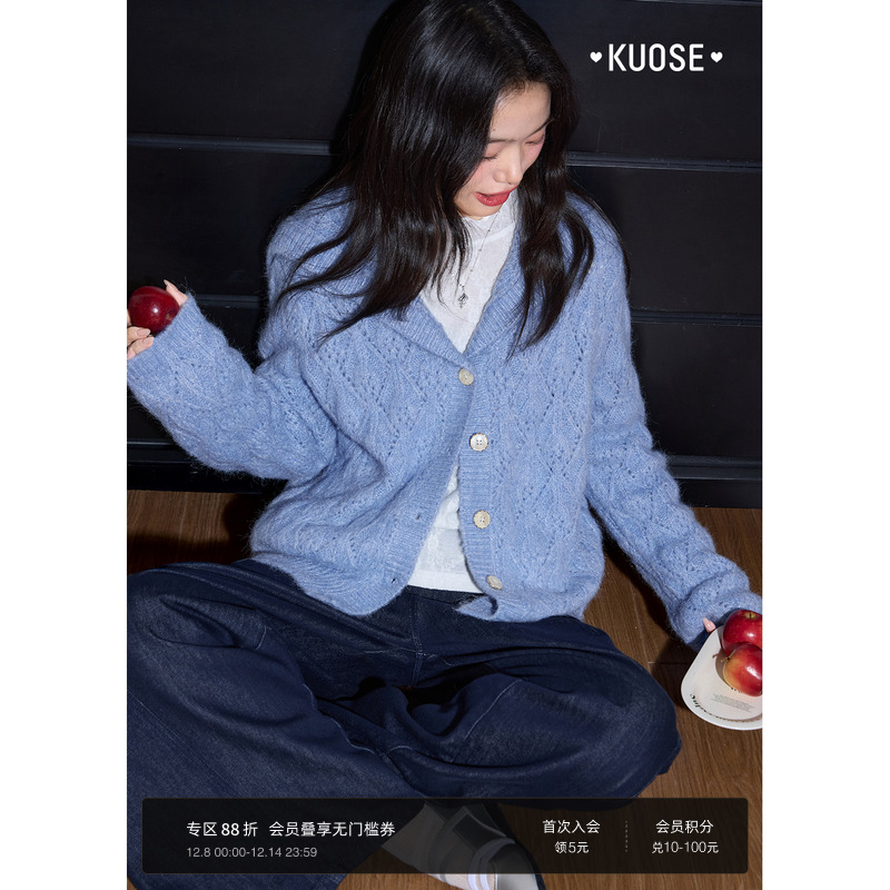 阔色蓝色慵懒海军领镂空针织开衫上衣女2025秋季新款长袖毛衣外套