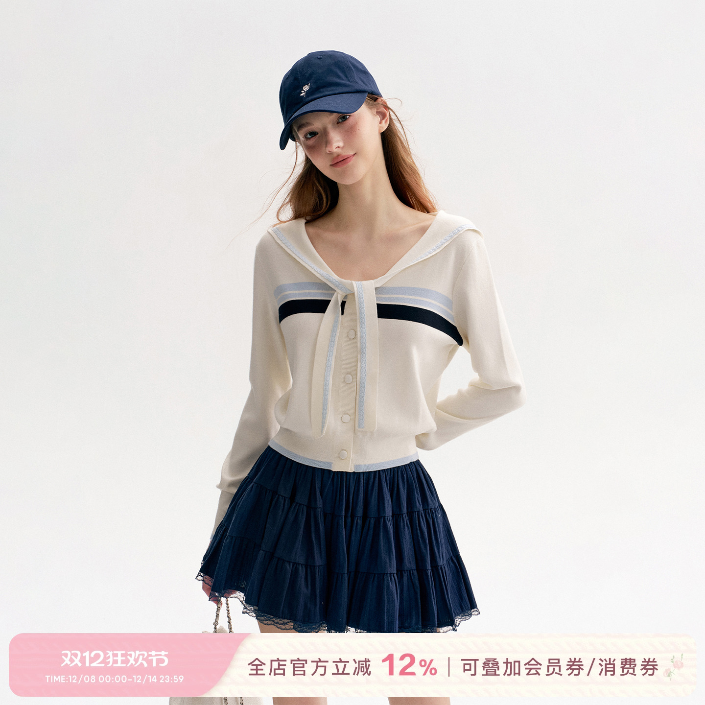 张小婉同款 Kroche 定染蕾丝花边 海军领系带披肩撞色毛衣开衫