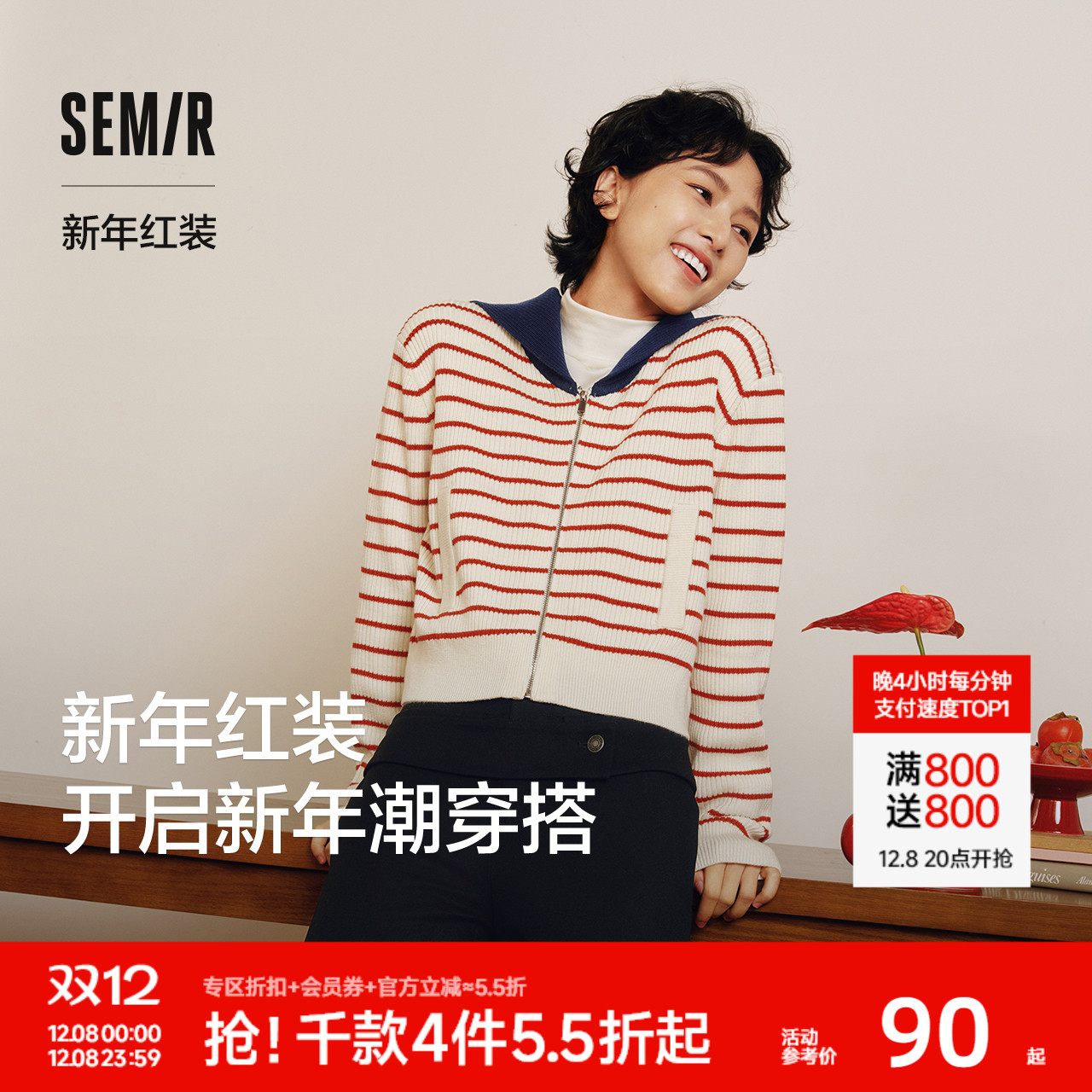 热风女士条纹毛衣2025年冬季新款半拉链翻领条纹针织衫海军风毛衣