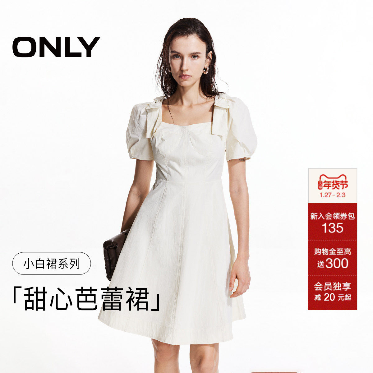 ONLY2025夏季新款复古蝴蝶结白色高腰泡泡袖A字裙短裙连衣裙女