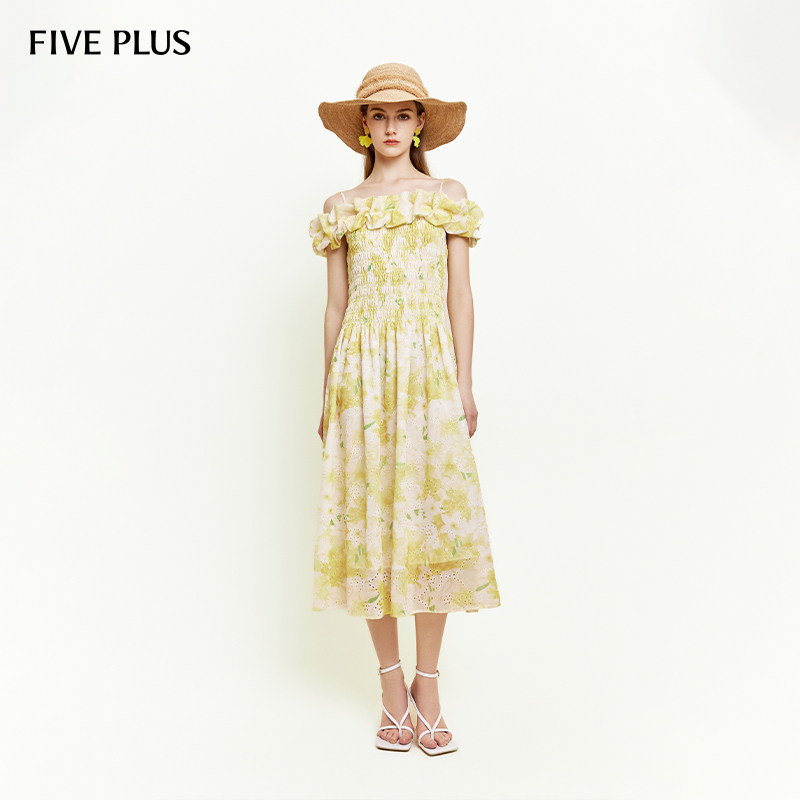FIVE PLUS女夏装波嬉风海边度假泡泡袖A字高腰碎花吊带裙连衣裙