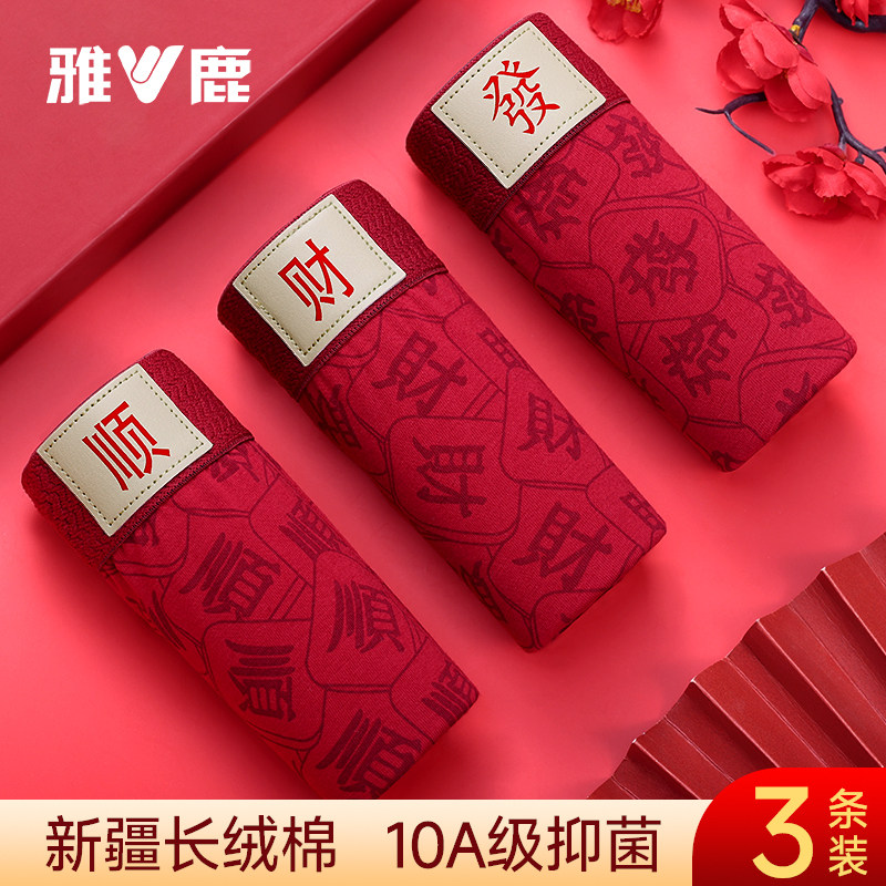 雅鹿本命年大红色男士内裤纯棉平角短裤衩男底裤结婚新款马年棉质