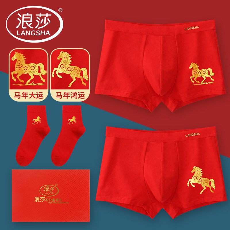 浪莎本命年男士内裤衩男生纯棉酒红色2026新款结婚袜子套装属马年