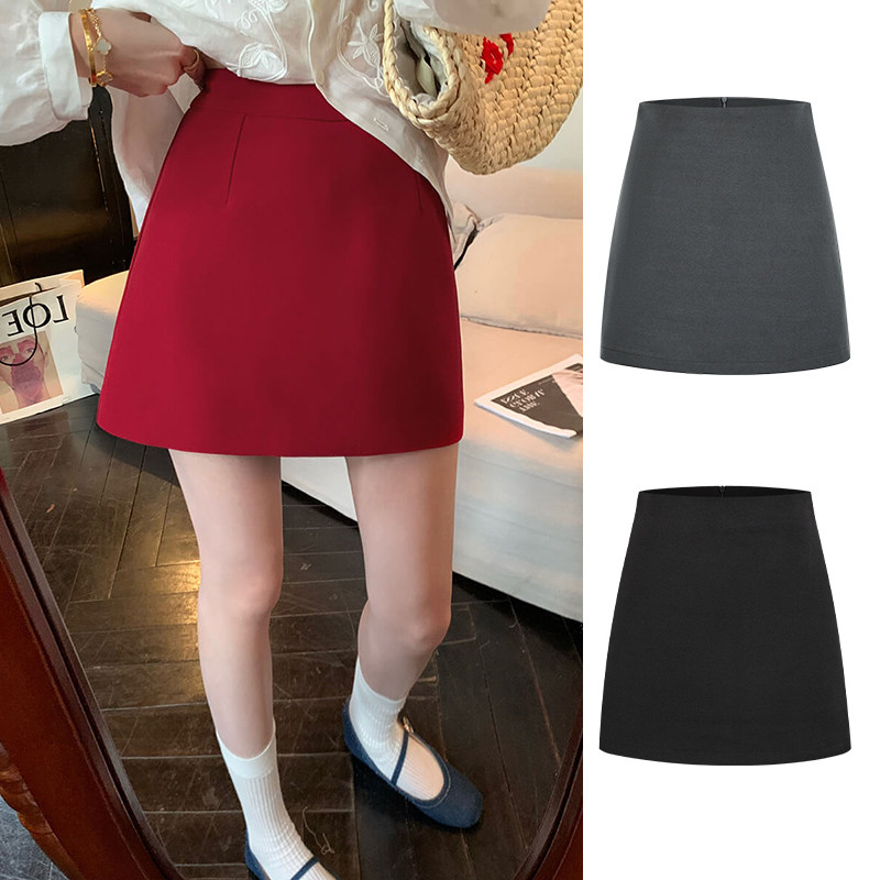 黑色毛呢半身裙秋冬女2025新款冬季半裙红色高腰a字短裙包臀裙子