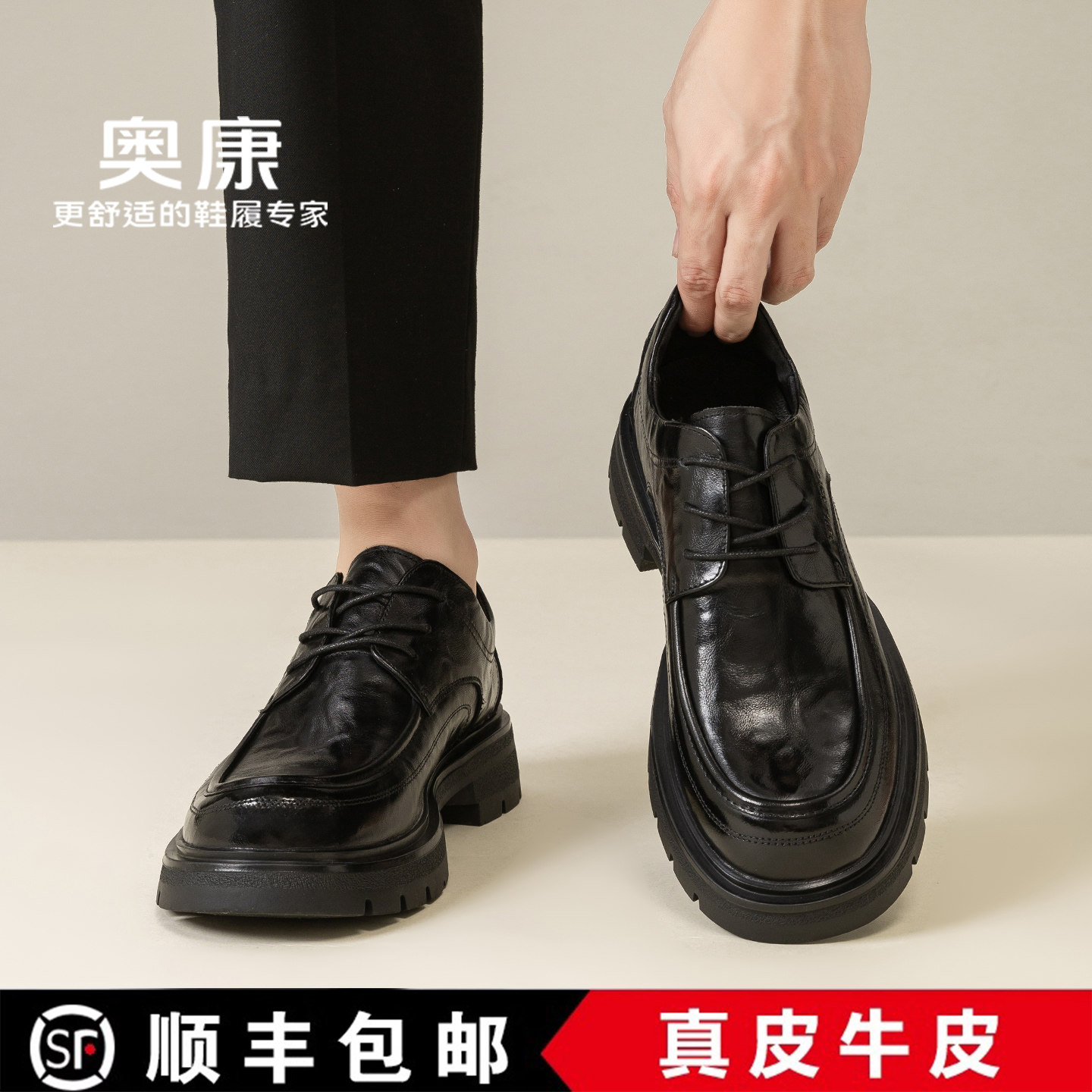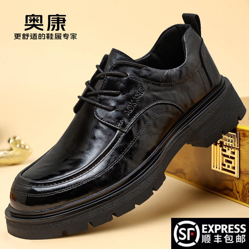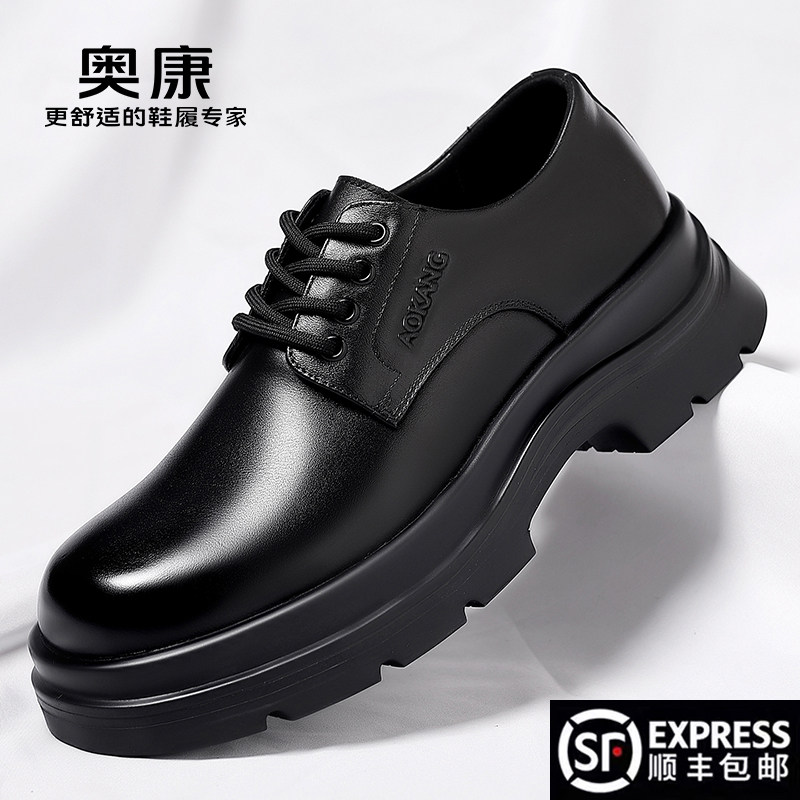 奥康男鞋2026新款真皮厚底德比鞋商务休闲皮鞋黑色增高系带大头鞋