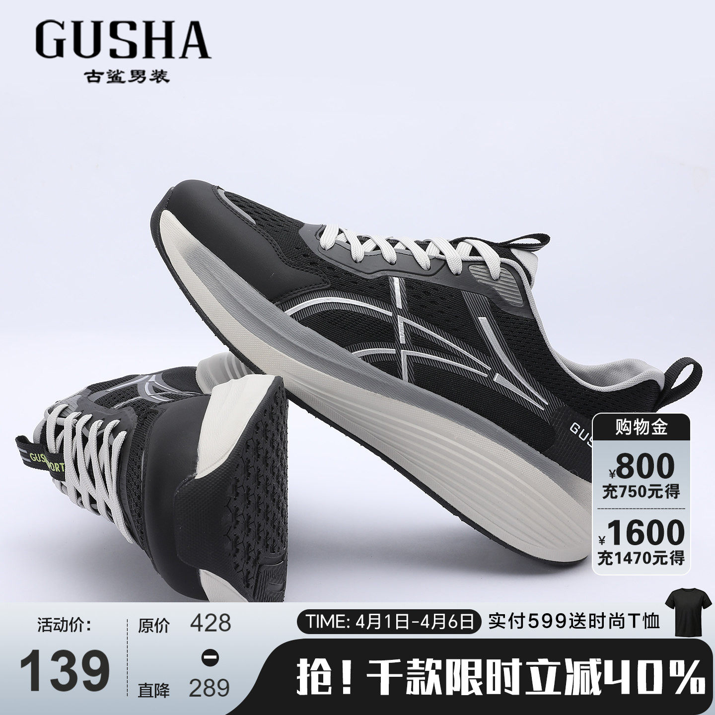 古鲨黑色拼色德训鞋男时尚舒适皮拼布厚底系带休闲鞋2026春装新款