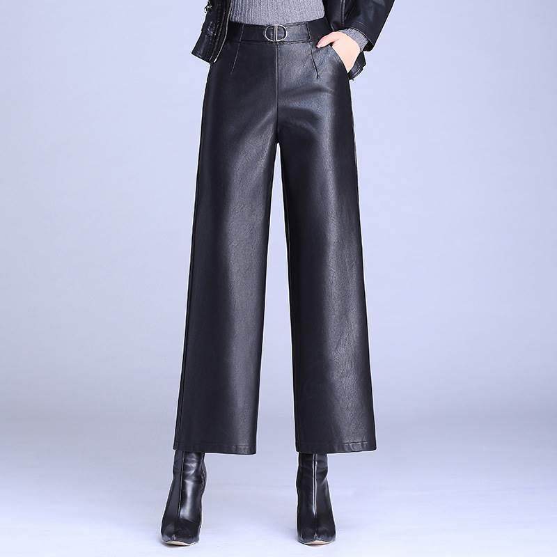 皮裤阔腿裤女士松紧腰直筒裤秋冬PU皮高腰垂感九分裤休闲裤宽腿裤