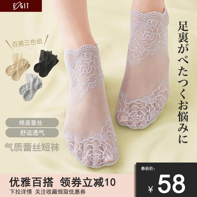包芯丝蕾丝短袜女4双夏季超薄透明花边水晶丝短筒袜松口防滑短筒