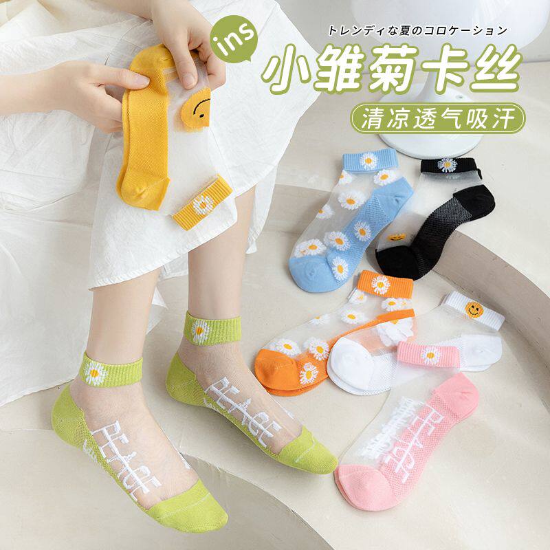 女士袜子夏天薄款纯棉底小雏菊水晶玻璃丝短袜女夏季网红款ins潮