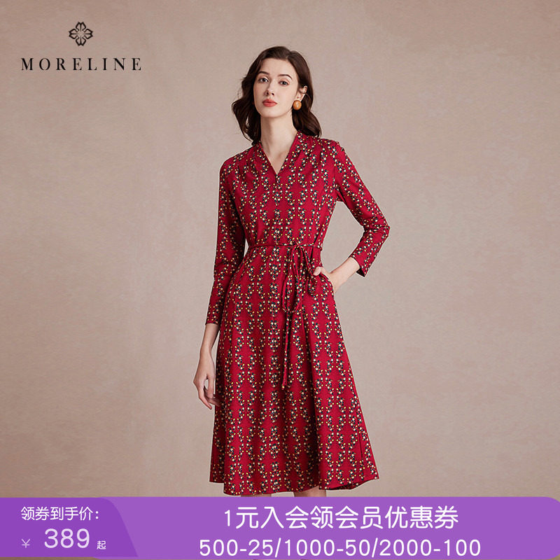 HONRN/红人印花v领系带收腰显瘦中长款a字连衣裙女夏HI22OL833