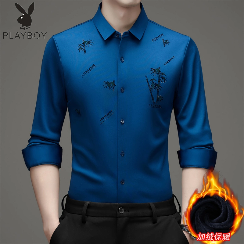 花花公子男士秋冬内衣保暖无痕衬衫新款长袖免烫宽松加绒加厚衬衣