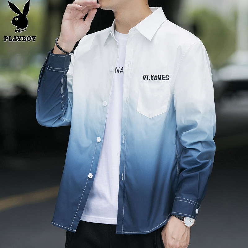 花花公子渐变长袖衬衫男士春秋季2024新款潮牌帅气休闲衬衣外套男