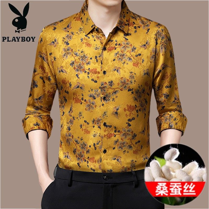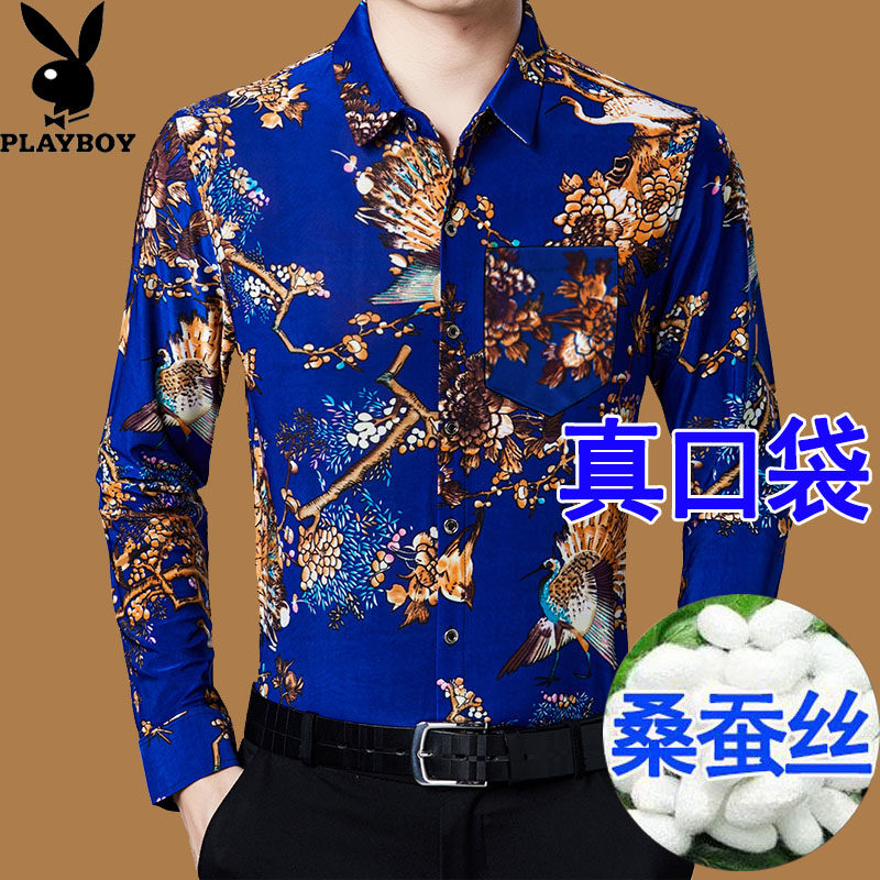 花花公子桑蚕丝花衬衫男长袖薄款春秋季印花弹力中年男士冰丝衬衣