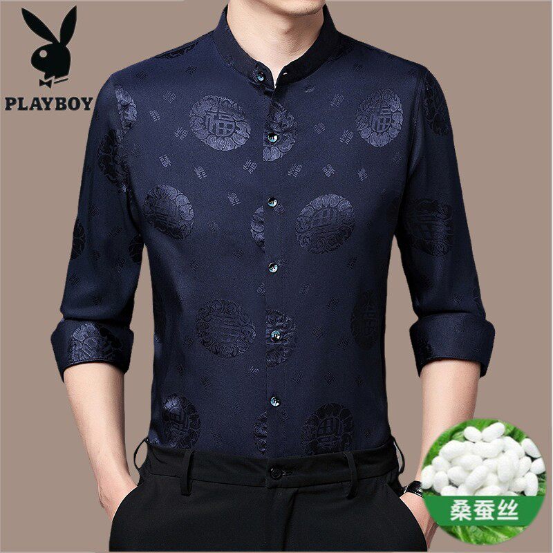 花花公子立领长袖衬衫男士春季桑蚕丝碎花免烫寸中老年真丝绸衬衣