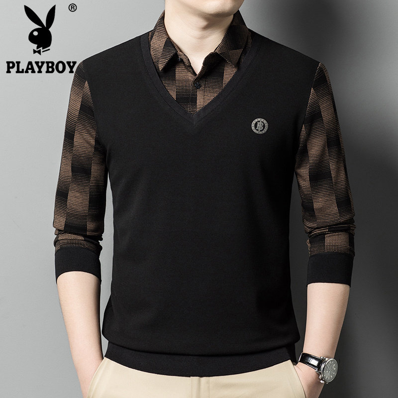 花花公子男秋冬款假两件衬衫领长袖t恤中年休闲加绒保暖打底上衣