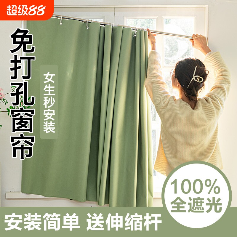 金蝉遮光窗帘免打孔安装杆一整套飘窗出租房隔音遮阳雪尼尔新款布