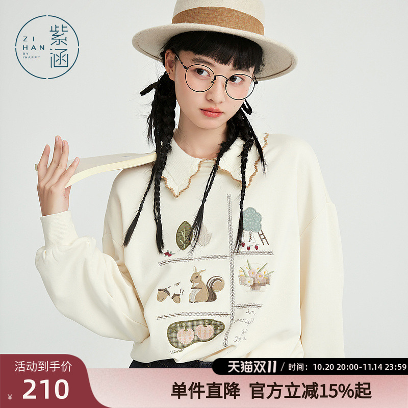 紫涵趣味刺绣polo领套头卫衣女秋季甜美森系简约宽松休闲撞色上衣