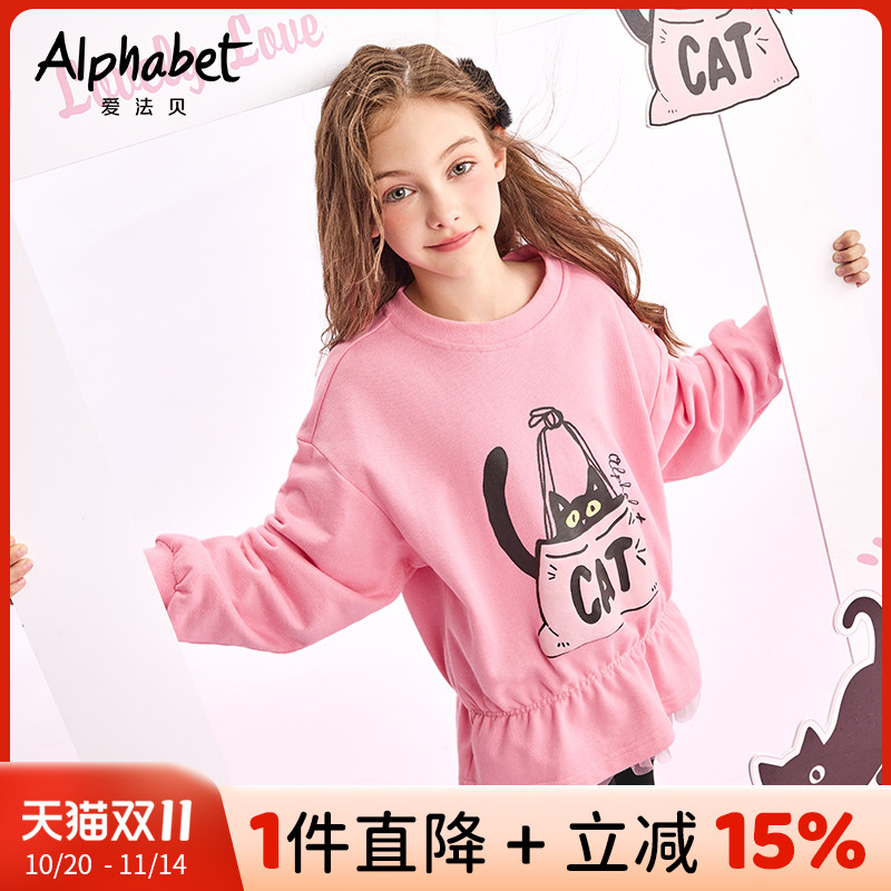 爱法贝秋新款女童卫衣宽松长款中大儿童装学生甜美可爱猫咪套头衫