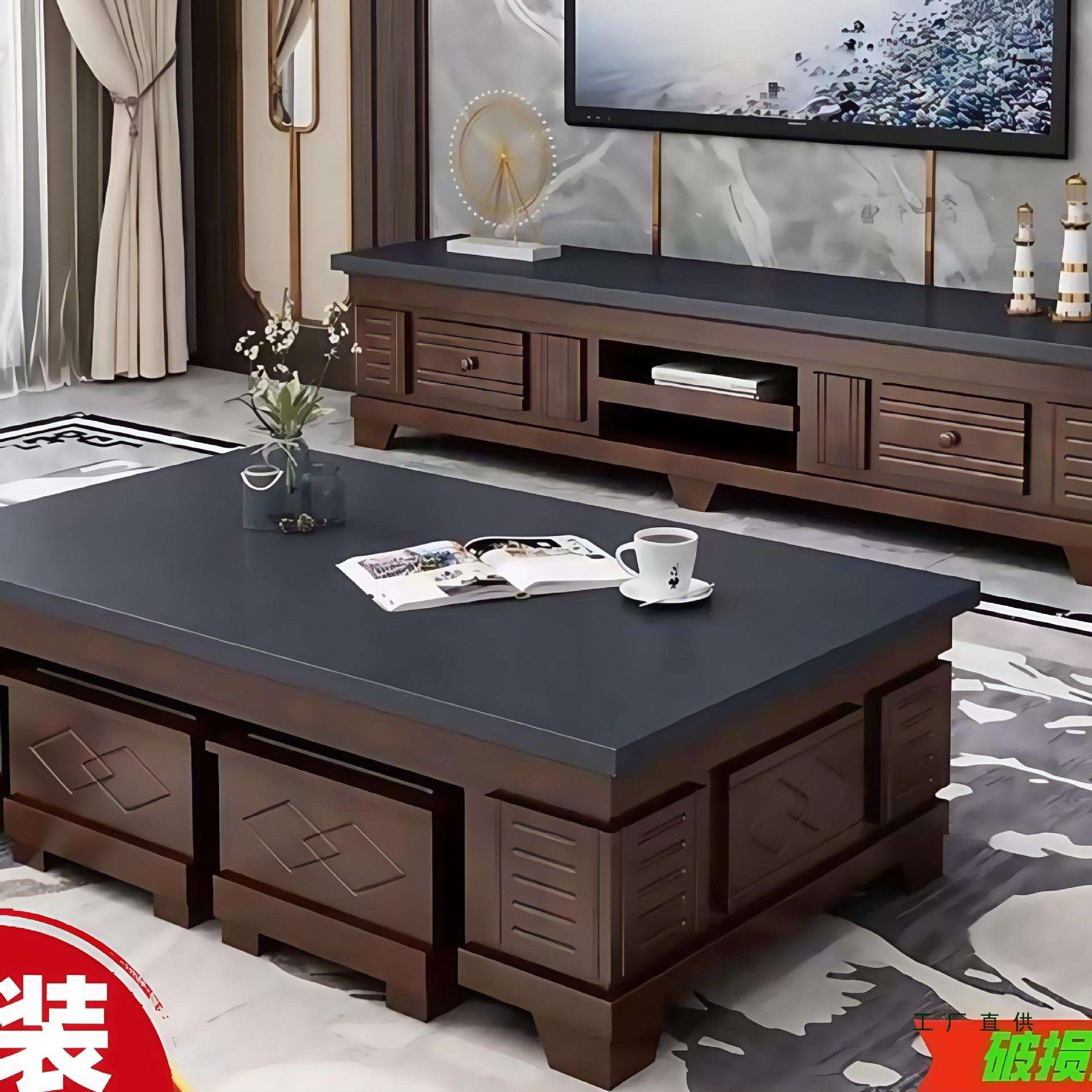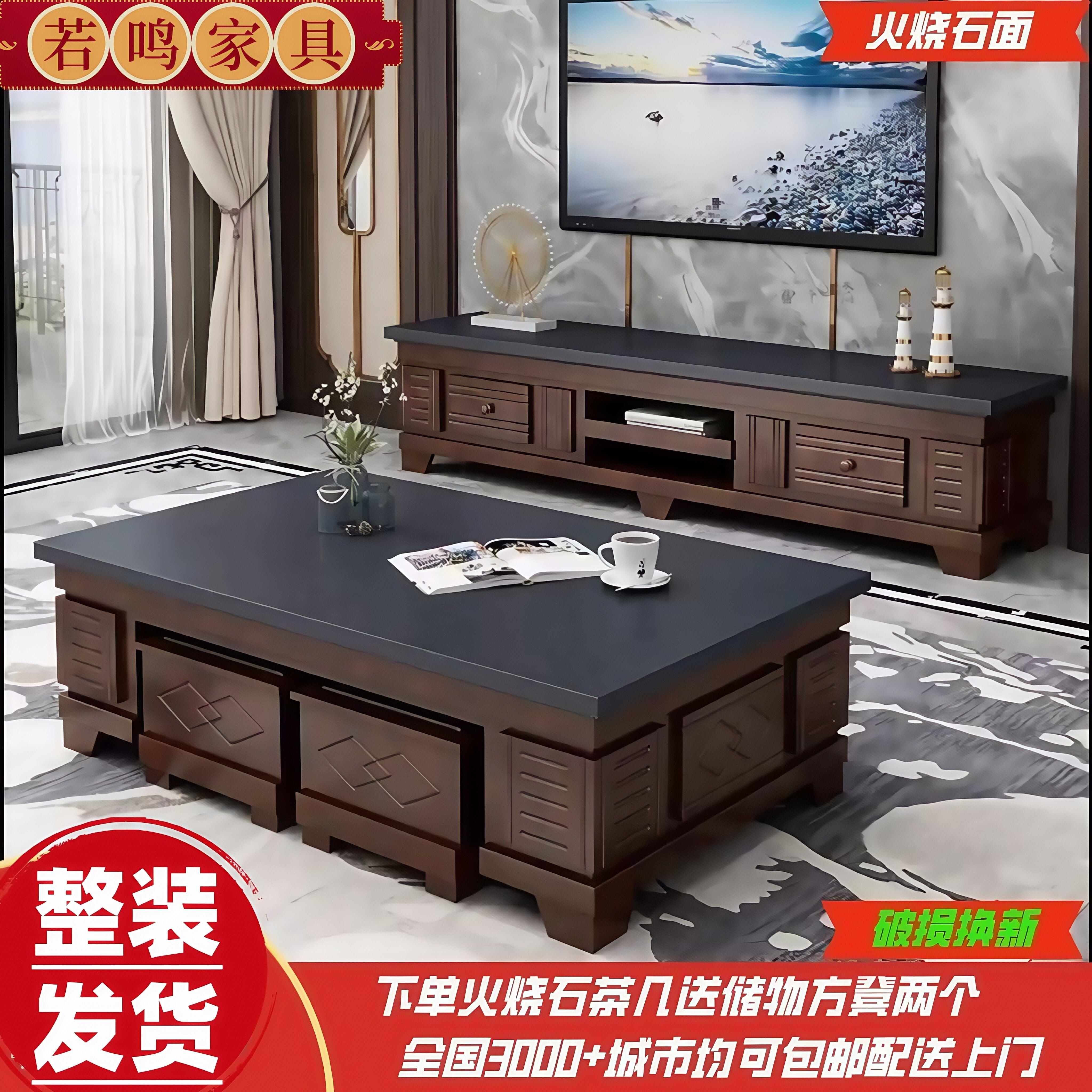 新中式火烧石实木茶几电视柜组合简约现代储物大理石客厅家用办公