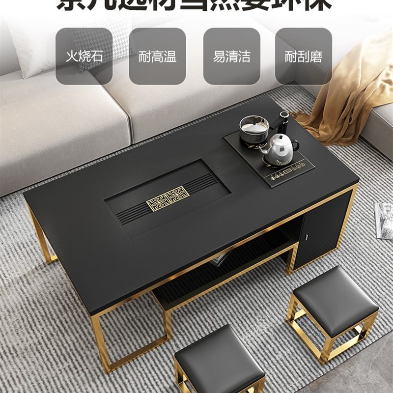 火烧石功夫茶几多功能桌岩板电视柜中式一体客厅办公室实木泡茶台
