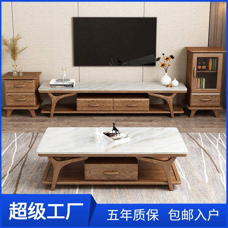 北欧新中式风格大理石火烧石全实木茶几电视柜组合白蜡木现代简约