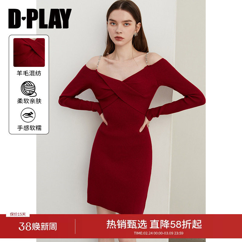 DPLAY2025秋季新款红色连衣裙女气质修身性感露肩针织毛衣裙子