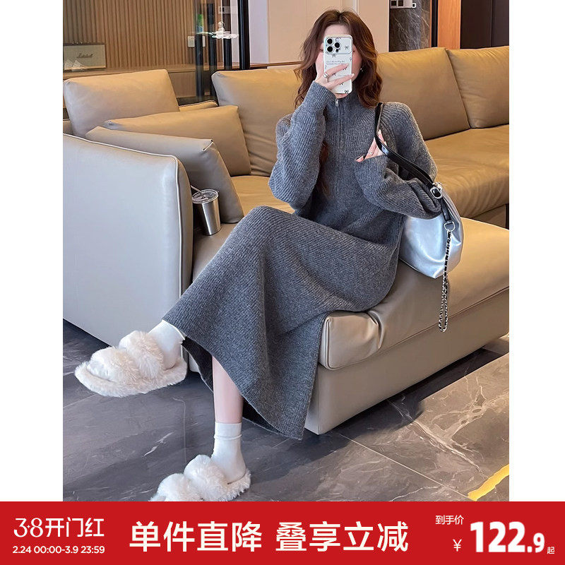 温柔风秋冬新款翻领拉链设计针织毛衣裙加厚慵懒风宽松长款连衣裙