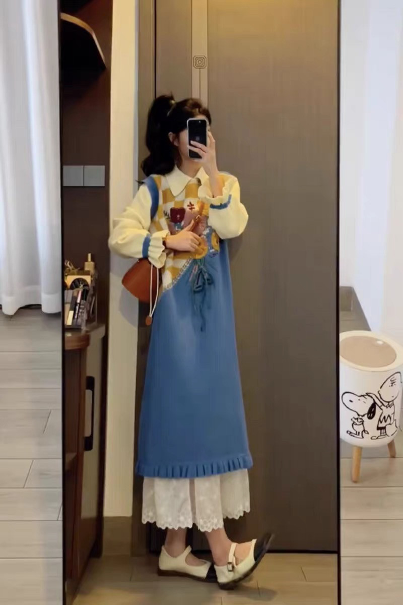 阔色藏蓝色假两件拼接长袖连衣裙2025秋冬季穿搭新女针织毛衣裙春