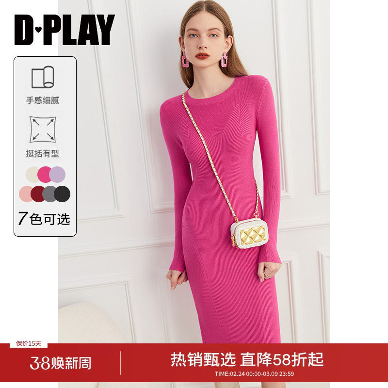 DPLAY【惠品】秋季新款名媛气质收腰连衣裙显白玫粉针织毛衣裙