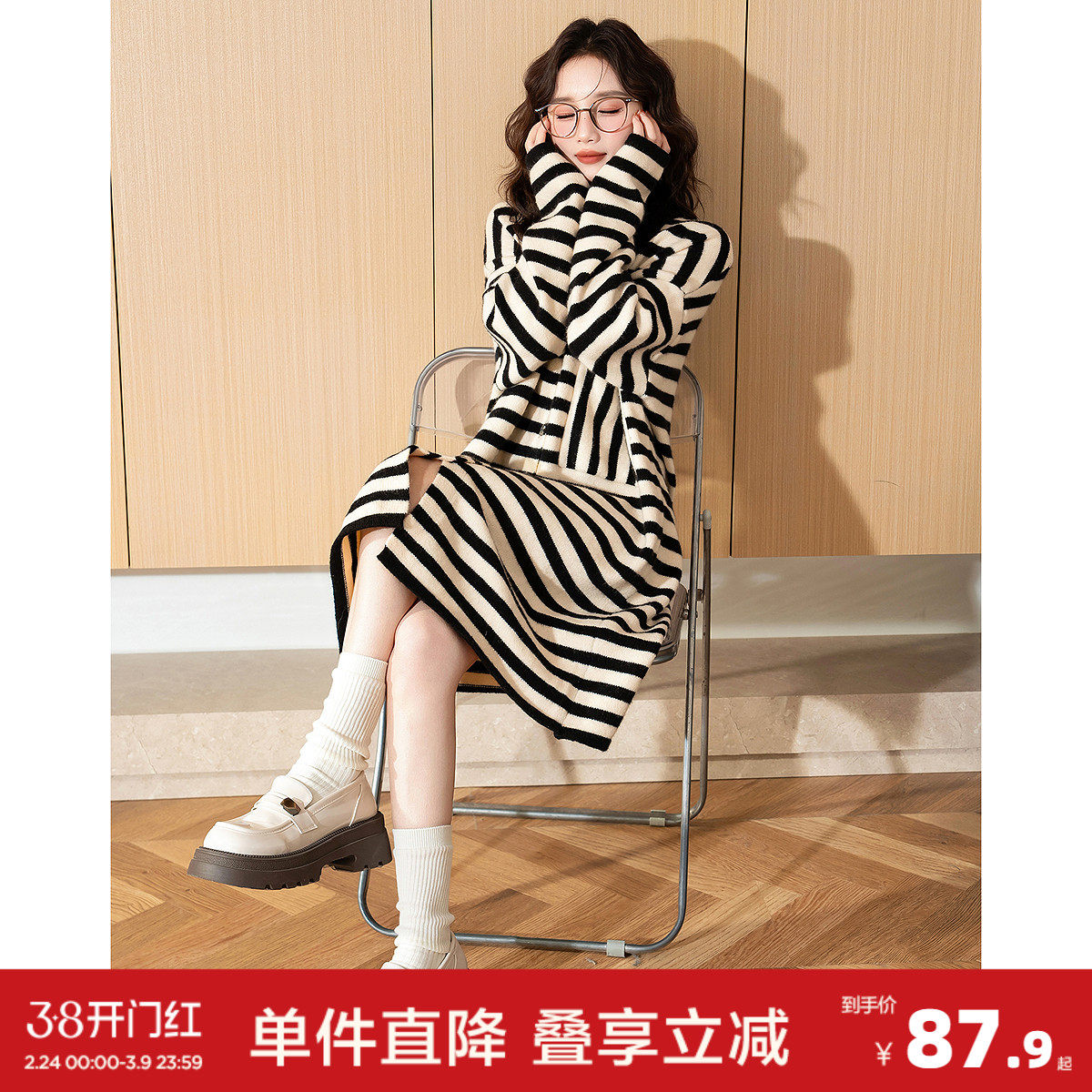 唐狮冬季小个子连衣裙女黑色条纹裙子中长款宽松外套针织毛衣裙p9