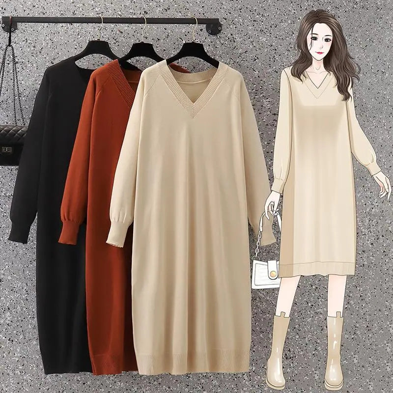 胖MM300斤超大码宽松法式温柔风纯色V领女秋冬长袖打底针织毛衣裙